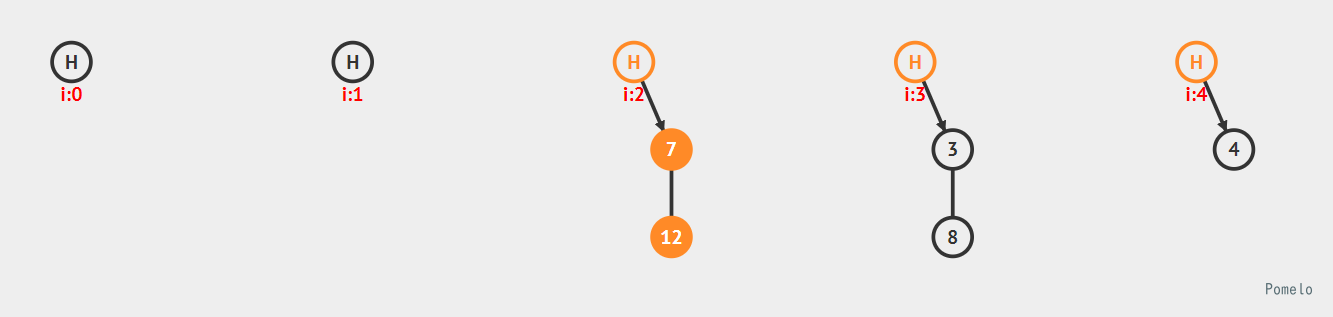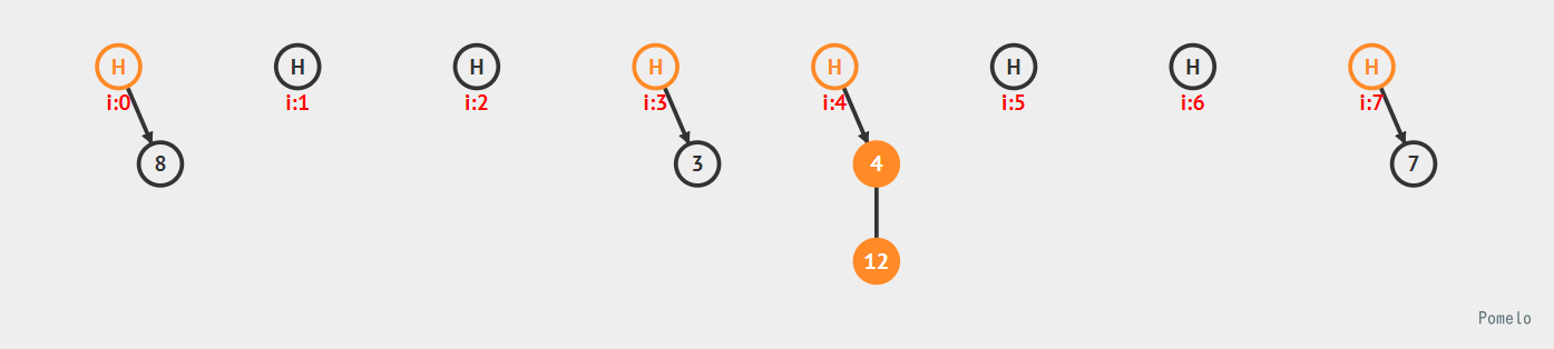 我们将 {3, 4, 7, 8, 12} 五个数字对这个哈希表长n = 8取余, 能得到上面图片中的哈希表.