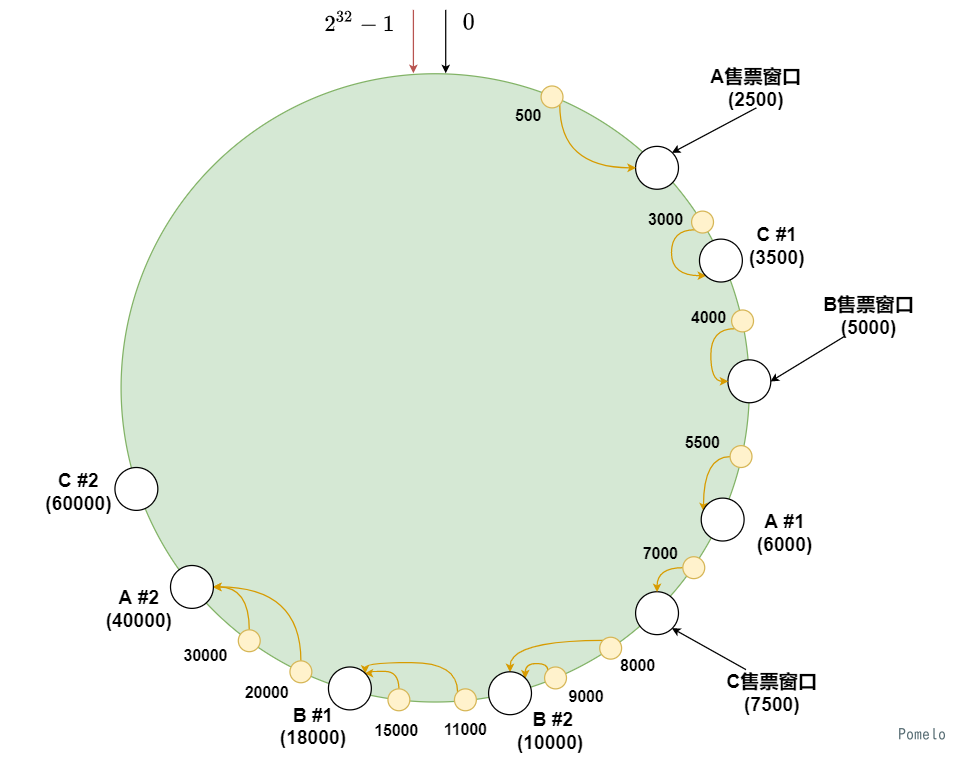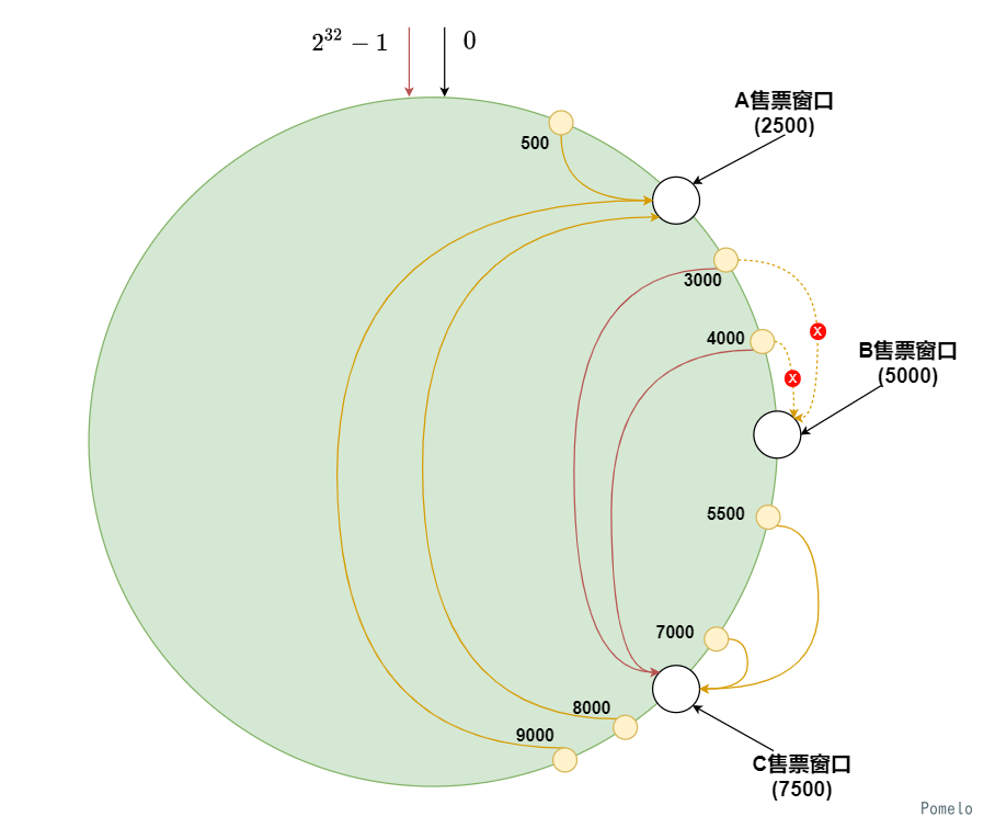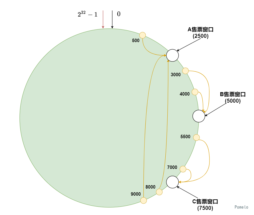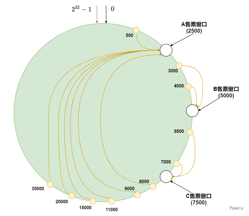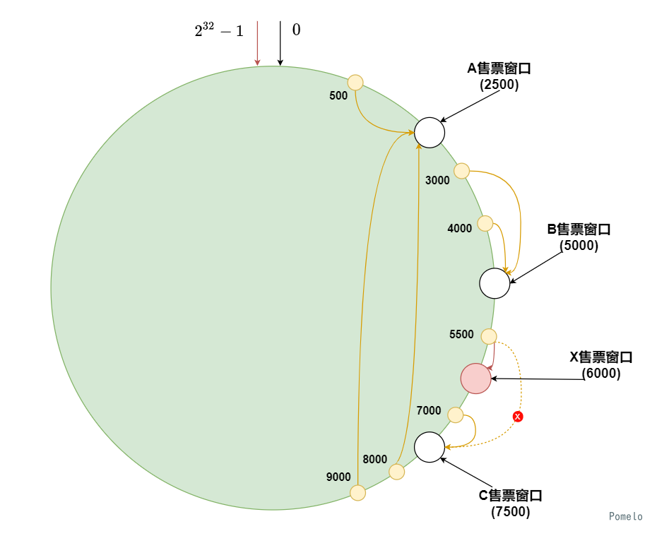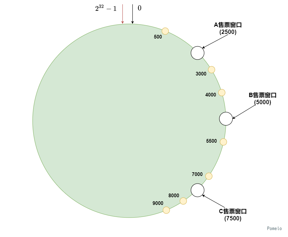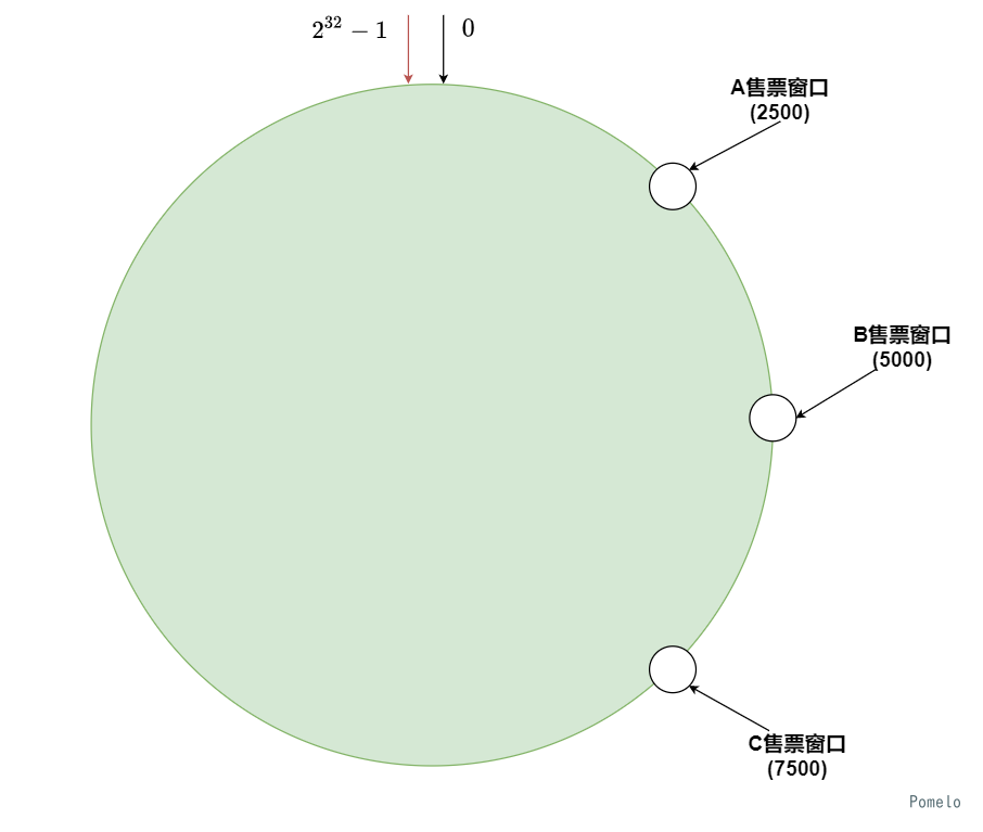 由上可见, 如果有N个售票窗口, 并且这N个窗口均匀分布, 那么新增或移除K个窗口只会对 $\frac KN$ 的用户造成影响. 这远远小于传统哈希算法改变表长带来的影响